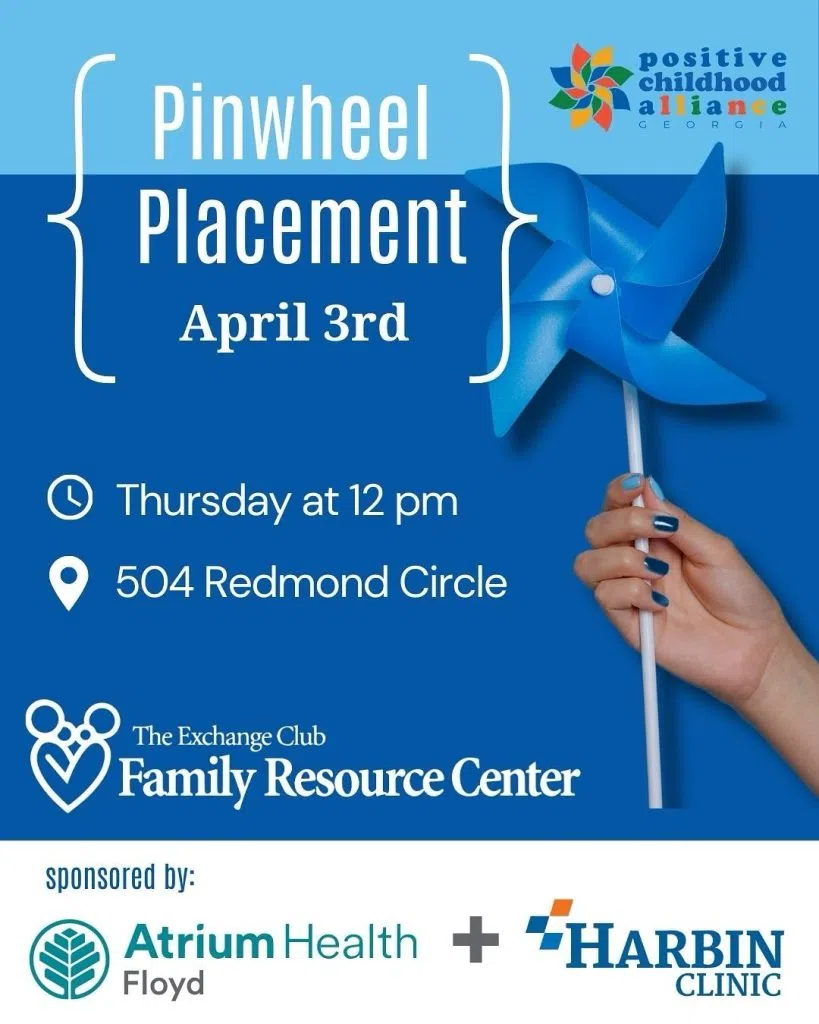 Atrium Health Floyd and Harbin Clinic are co-hosting the annual Pinwheel Planting event with the Exchange Club Family Resource Center to mark Child Abuse Prevention Month.