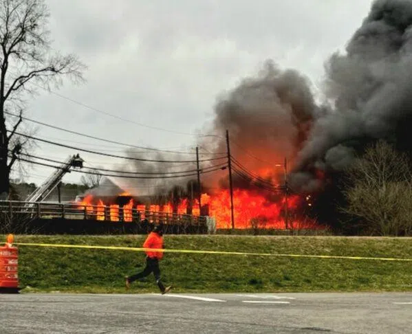 Photos from earlier Tuesday afternoon show flames consuming a large section of the building and thick black smoke billowing above the building and across West Avenue.