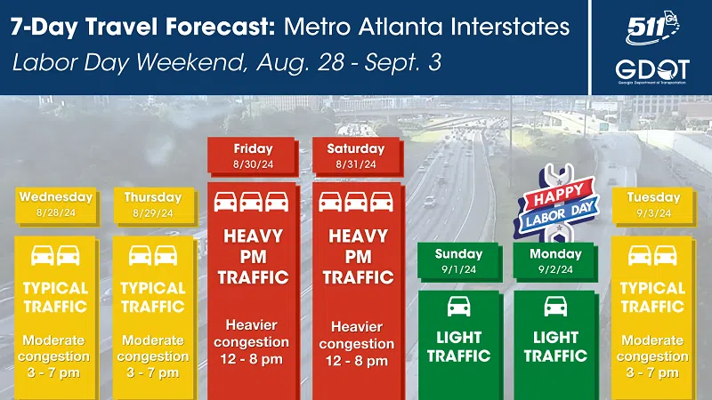 To allow for the anticipated increase in Labor Day weekend traffic congestion, the Georgia Department of Transportation (Georgia DOT) announced today the suspension of lane closures on Georgia interstates and state routes beginning Friday, August 30 at 12 p.m. until 5 a.m. Tuesday, September 3.