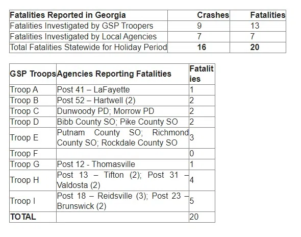 Statewide, Georgia State Patrol Troopers investigated nine fatal crashes resulting in 13 fatalities. Local agencies reporting traffic deaths during the holiday period include the Bibb County Sheriff’s Office, Dunwoody Police Department, Morrow Police Department, Pike County Sheriff’s Office, Putnam County Sheriff’s Office, Richmond County Sheriff’s Office, and Rockdale County Sheriff’s Office.
